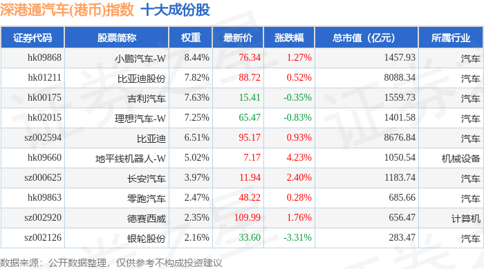 深港通汽车(港币)(983040)指数十大成份股详情如下:
