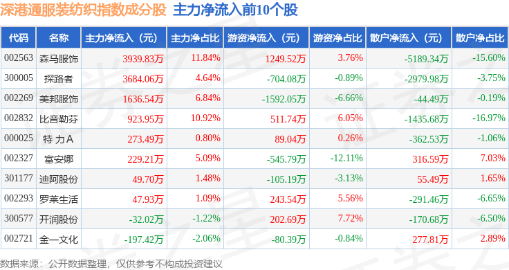 资金流向方面,深港通服装纺织(983041)指数成份股当日主力资金净流入合计1982.27万元,游资资金净流出合计4207.05万元,散户资金净流入合计2224.79万元。成份股资金流向详情见下表: