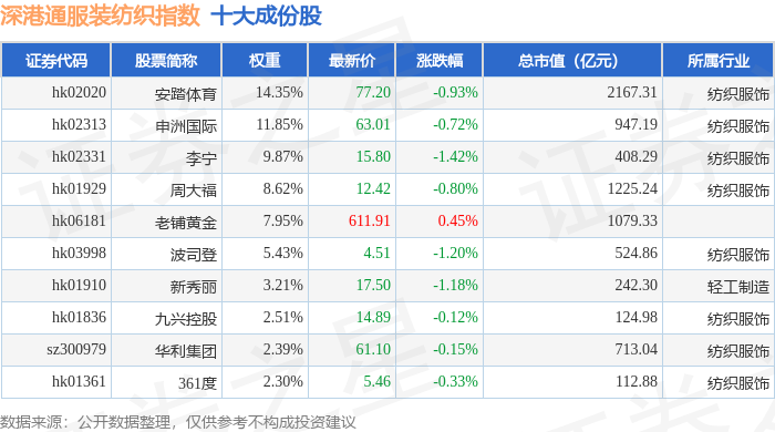 深港通服装纺织(983041)指数十大成份股详情如下: