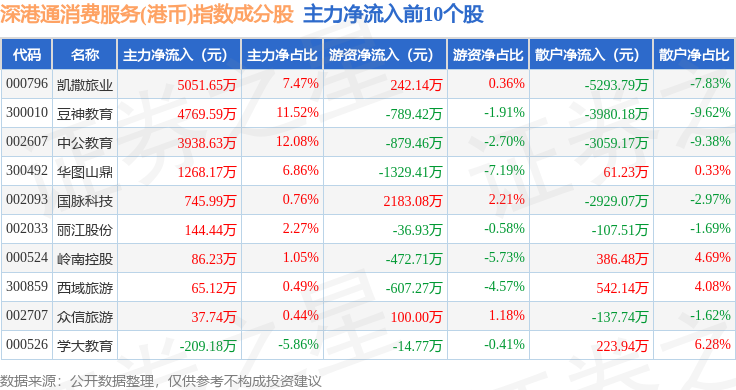 资金流向方面,深港通消费服务(港币)(983046)指数成份股当日主力资金净流入合计5493.98万元,游资资金净流出合计1684.6万元,散户资金净流出合计3809.38万元。成份股资金流向详情见下表: