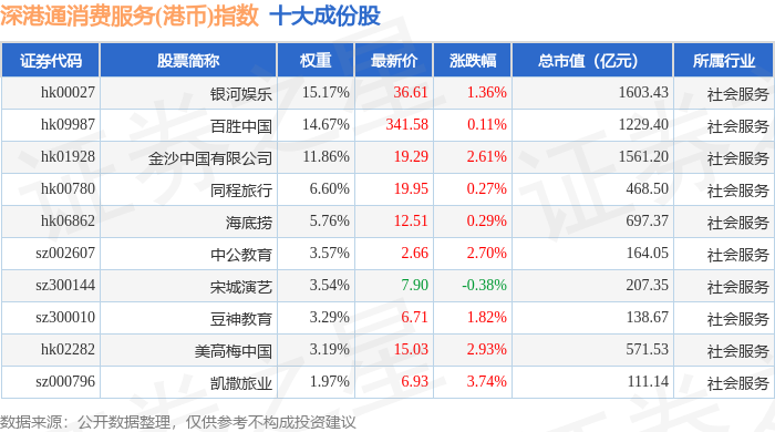 深港通消费服务(港币)(983046)指数十大成份股详情如下: