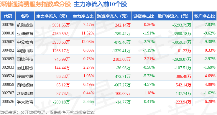 资金流向方面,深港通消费服务(983045)指数成份股当日主力资金净流入合计5493.98万元,游资资金净流出合计1684.6万元,散户资金净流出合计3809.38万元。成份股资金流向详情见下表: