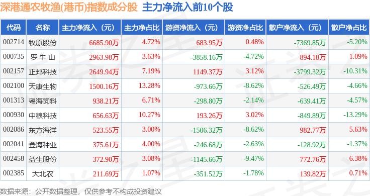 资金流向方面,深港通农牧渔(港币)(983052)指数成份股当日主力资金净流出合计1905.99万元,游资资金净流出合计8321.85万元,散户资金净流入合计1.02亿元。成份股资金流向详情见下表: