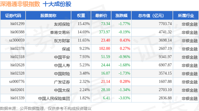 证券之星消息,11月28日,深港通非银(983053)指数报收于7053.68点,跌0.49%,成交143.51亿元,换手率0.42%。当日该指数成份股中,上涨的有38家,海德股份以3.07%的涨幅领涨,下跌的有18家,中国人民保险集团以3.03%的跌幅领跌。