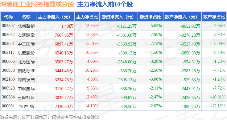 资金流向方面,深港通工业服务(983055)指数成份股当日主力资金净流入合计1.15亿元,游资资金净流出合计2.73亿元,散户资金净流入合计1.57亿元。成份股资金流向详情见下表: