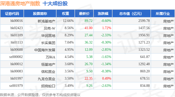 证券之星消息,11月28日,深港通房地产(983071)指数报收于2349.36点,跌0.54%,成交122.28亿元,换手率1.05%。当日该指数成份股中,上涨的有32家,世联行以10.18%的涨幅领涨,下跌的有34家,华润万象生活以3.1%的跌幅领跌。