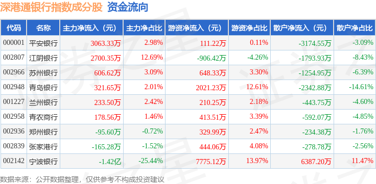 资金流向方面,深港通银行(983081)指数成份股当日主力资金净流出合计7319.2万元,游资资金净流入合计1.1亿元,散户资金净流出合计3728.1万元。成份股资金流向详情见下表: