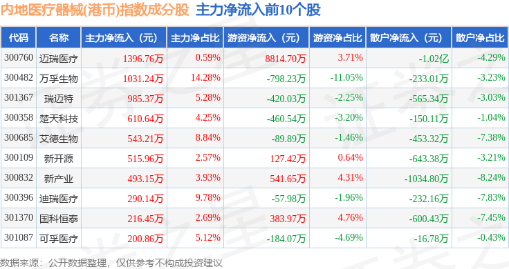资金流向方面,内地医疗器械(港币)(983104)指数成份股当日主力资金净流出合计1.14亿元,游资资金净流入合计7990.82万元,散户资金净流入合计3427.32万元。成份股资金流向详情见下表: