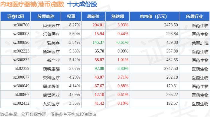 内地医疗器械(港币)(983104)指数十大成份股详情如下: