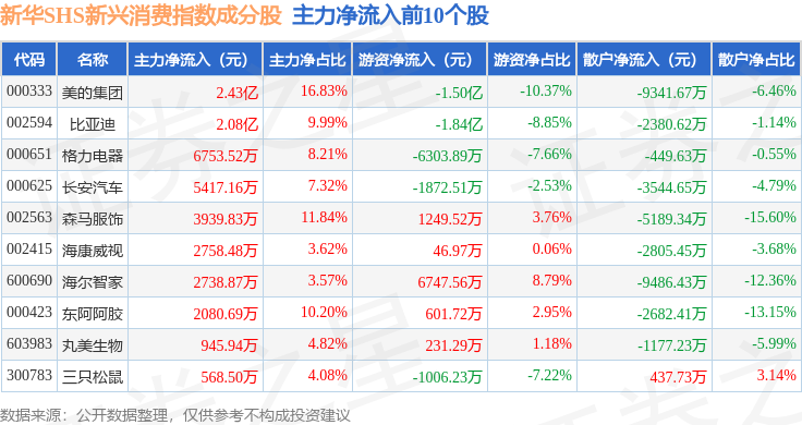 资金流向方面,新华SHS新兴消费(989006)指数成份股当日主力资金净流入合计3.25亿元,游资资金净流出合计2.17亿元,散户资金净流出合计1.08亿元。成份股资金流向详情见下表: