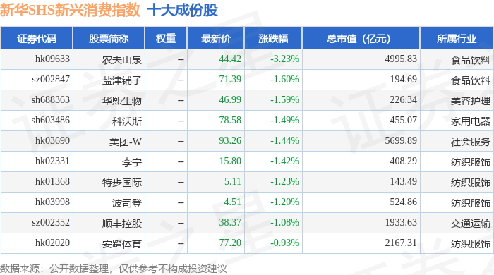 新华SHS新兴消费(989006)指数十大成份股详情如下: