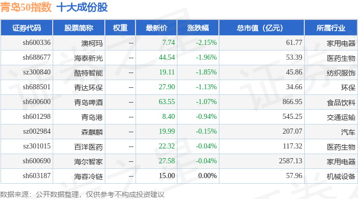 青岛50(989011)指数十大成份股详情如下: