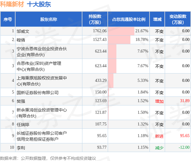 根据科隆新材2025年三季报公布的十大股东详情如下: