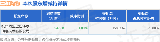 证券之星消息,11月28日三江购物发布公告《三江购物:三江购物关于持股5%以上股东权益变动触及1%刻度的提示性公告》,其股东杭州阿里巴巴泽泰信息技术有限公司于2025年11月27日至2025年11月28日间合计减持547.68万股,占公司目前总股本的1.0%,变动期间该股股价下跌2.92%,截止11月28日收盘报16.98元。