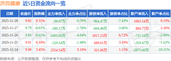 证券之星消息,截至2025年11月28日收盘,济民健康(603222)报收于9.82元,上涨0.31%,换手率2.54%,成交量13.33万手,成交额1.3亿元。