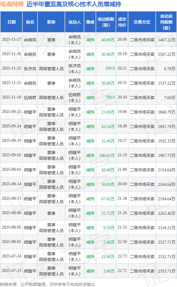 电魂网络近半年内的董监高及核心技术人员增减持详情如下: