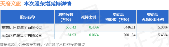 证券之星消息,11月28日天府文旅发布公告《天府文旅:持股5%以上股东股份减持比例触及1%刻度并解除质押暨权益变动触及5%的公告》,其股东莱茵达控股集团有限公司于2025年11月26日至2025年11月27日间合计减持637.36万股,占公司目前总股本的0.4943%,变动期间该股股价下跌1.02%,截止11月27日收盘报5.83元。