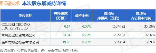 证券之星消息,11月28日科瑞技术发布公告《科瑞技术:关于持股5%以上股东权益变动后持股比例触及1%整数倍的提示性公告》,其股东深圳市华苗投资有限公司、COLIBRI TECHNOLOGIES PTE LTD、青岛鹰诺投资有限公司于2025年9月22日至2025年11月28日间合计减持113.04万股,占公司目前总股本的0.2691%,变动期间该股股价上涨8.97%,截止11月28日收盘报19.8元。