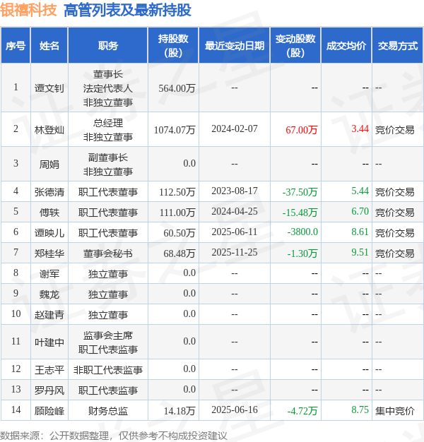 银禧科技的高管列表及最新持股情况如下: