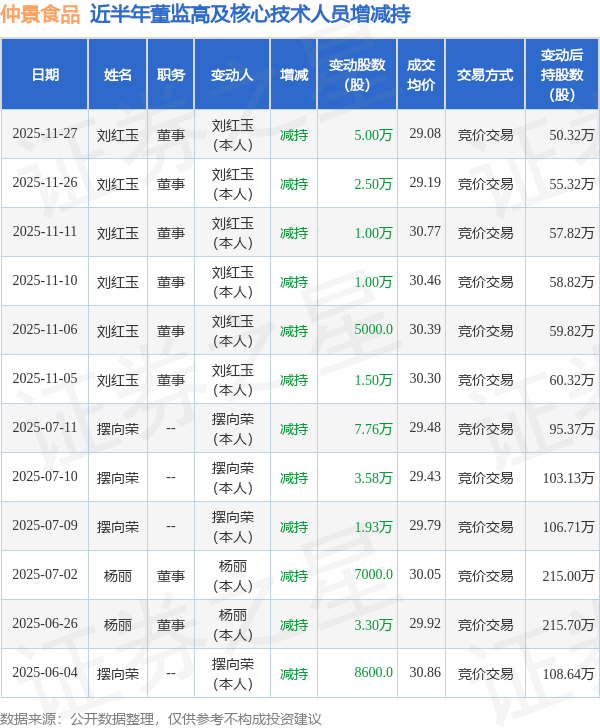 仲景食品近半年内的董监高及核心技术人员增减持详情如下:
