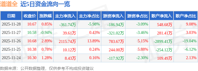 证券之星消息,截至2025年11月28日收盘,道道全(002852)报收于10.67元,上涨0.85%,换手率2.0%,成交量5.71万手,成交额6044.74万元。