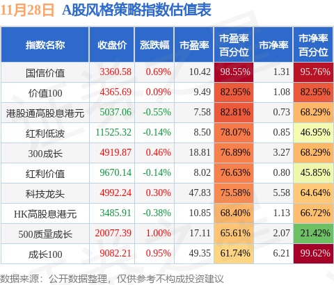 风格策略指数方面,国信价值的市盈率百分位较高,为98.55%。而成长100的市盈率百分位较低,为61.74%。