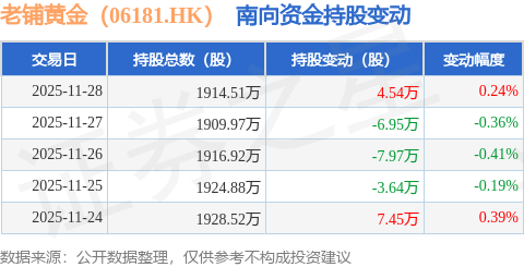 证券之星消息,11月28日南向资金增持4.54万股老铺黄金(06181.HK)。近5个交易日中,获南向资金减持的有3天,累计净减持6.57万股。近20个交易日中,获南向资金增持的有8天,累计净增持72.11万股。截至目前,南向资金持有老铺黄金(06181.HK)1914.51万股,占公司已发行普通股的13.36%。