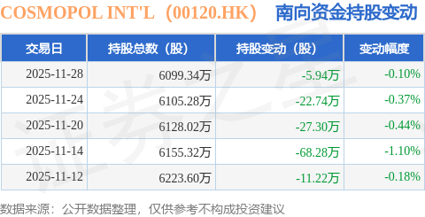 证券之星消息,11月28日南向资金减持5.94万股COSMOPOL INT'L(00120.HK)。近5个交易日中,获南向资金减持的有5天,累计净减持135.48万股。近20个交易日中,获南向资金减持的有20天,累计净减持229.38万股。截至目前,南向资金持有COSMOPOL INT'L(00120.HK)6099.34万股,占公司已发行普通股的4.54%。