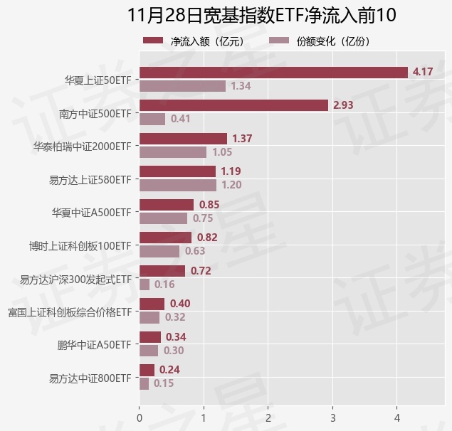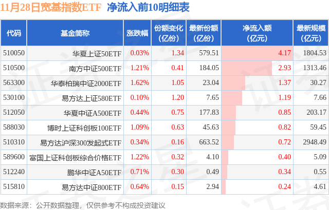 当日有31只宽基指数ETF基金出现资金净流入,其中净流入排首位的是华夏上证50ETF(510050),份额增加了1.34亿份,净流入额为4.17亿元。