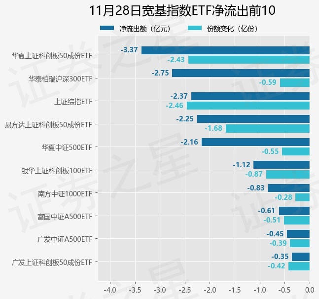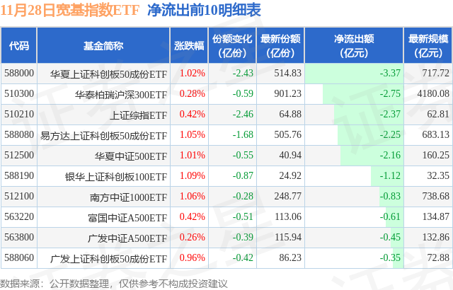 当日有61只宽基指数ETF基金出现资金净流出,其中净流出排首位的是华夏上证科创板50成份ETF(588000),份额减少了2.43亿份,净流出额为3.37亿元。