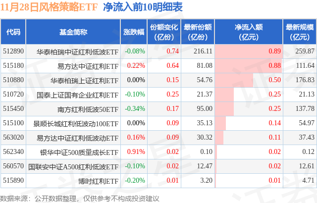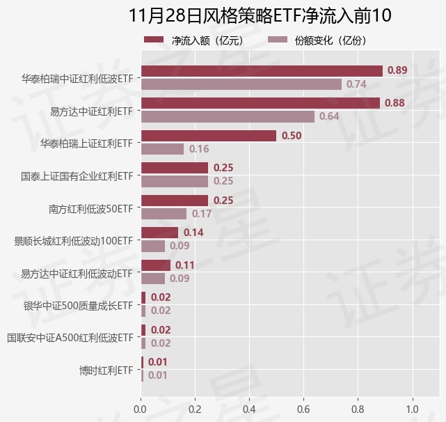 当日有12只风格策略ETF基金出现资金净流入,其中净流入排首位的是华泰柏瑞中证红利低波ETF(512890),份额增加了7400.0万份,净流入额为8896.29万元。