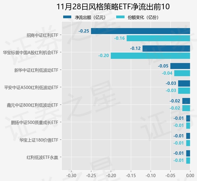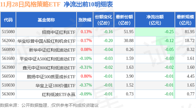 当日有8只风格策略ETF基金出现资金净流出,其中净流出排首位的是招商中证红利ETF(515080),份额减少了1600.0万份,净流出额为2520.03万元。