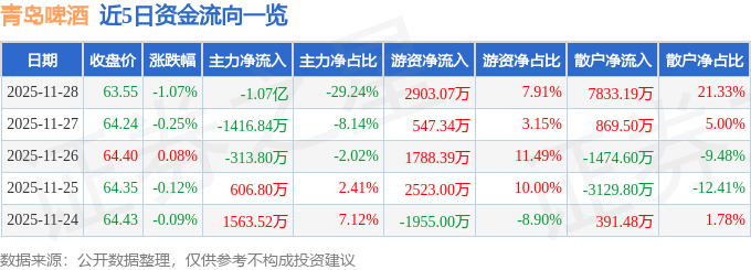 证券之星消息,截至2025年11月28日收盘,青岛啤酒(600600)报收于63.55元,下跌1.07%,换手率0.81%,成交量5.76万手,成交额3.67亿元。
