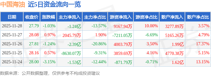证券之星消息,截至2025年11月28日收盘,中国海油(600938)报收于27.79元,下跌1.03%,换手率1.1%,成交量32.89万手,成交额9.17亿元。