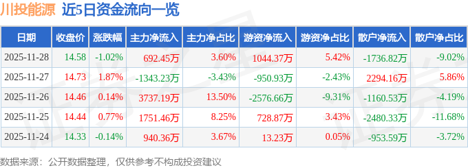 证券之星消息,截至2025年11月28日收盘,川投能源(600674)报收于14.58元,下跌1.02%,换手率0.27%,成交量13.18万手,成交额1.93亿元。
