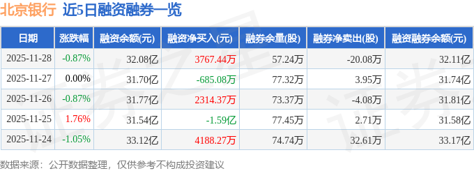 北京银行融资融券信息显示,融资方面,当日融资买入1.23亿元,融资偿还8491.15万元,融资净买入3767.44万元。融券方面,融券卖出3.06万股,融券偿还23.14万股,融券余量57.24万股,融券余额325.14万元。融资融券余额32.11亿元。