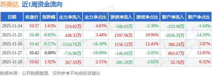 资金流向数据方面,本周苏美达主力资金合计净流出953.79万元,游资资金合计净流入1766.46万元,散户资金合计净流出812.67万元。本周资金流向一览见下表: