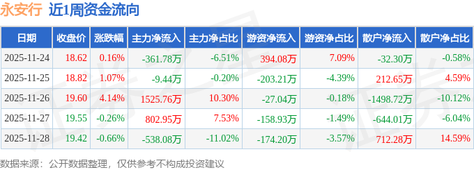 资金流向数据方面,本周永安行主力资金合计净流入1419.4万元,游资资金合计净流出169.29万元,散户资金合计净流出1250.1万元。本周资金流向一览见下表: