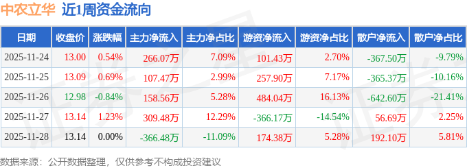 资金流向数据方面,本周中农立华主力资金合计净流入475.1万元,游资资金合计净流入651.57万元,散户资金合计净流出1126.67万元。本周资金流向一览见下表: