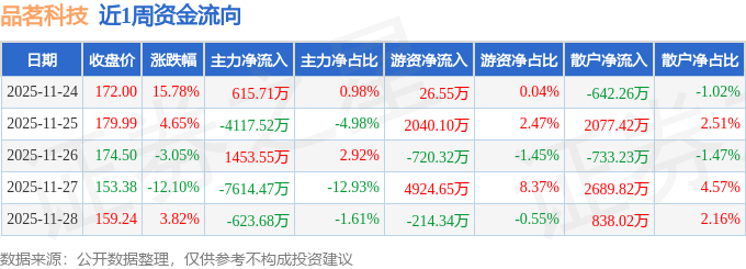 资金流向数据方面,本周品茗科技主力资金合计净流出1.03亿元,游资资金合计净流入6056.63万元,散户资金合计净流入4229.78万元。本周资金流向一览见下表: