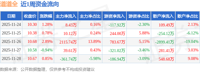 资金流向数据方面,本周道道全主力资金合计净流入1812.16万元,游资资金合计净流入401.79万元,散户资金合计净流出2213.94万元。本周资金流向一览见下表: