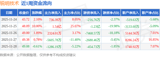 资金流向数据方面,本周锐明技术主力资金合计净流入1.16亿元,游资资金合计净流出2.31亿元,散户资金合计净流入1.15亿元。本周资金流向一览见下表: