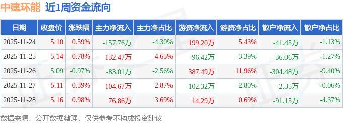 资金流向数据方面,本周中建环能主力资金合计净流入73.23万元,游资资金合计净流入402.24万元,散户资金合计净流出475.48万元。本周资金流向一览见下表:
