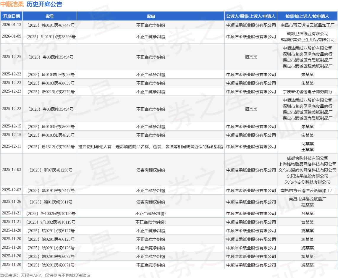 案号:(2025)浙07民初1258号根据统计,近一年内以中顺洁柔纸业股份有限公司为当事人的历史开庭公告有298则,其中案由为“不正当竞争纠纷”的公告以219则居首,其次为“侵害商标权纠纷”有33则,“擅自使用与他人有一定影响的商品名称、包装、装潢等相同或者近似的标识纠纷”有26则。历史开庭公告(前20条)如下:
