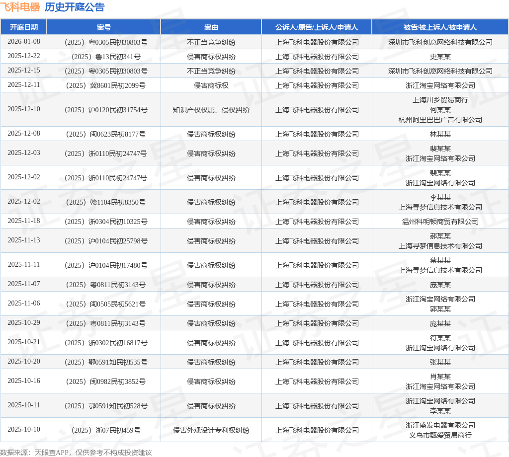 案号:(2025)浙0110民初24747号根据统计,近一年内以上海飞科电器股份有限公司为当事人的历史开庭公告有257则,其中案由为“侵害商标权纠纷”的公告以199则居首,其次为“不正当竞争纠纷”有18则,“侵害外观设计专利权纠纷”有9则。历史开庭公告(前20条)如下: