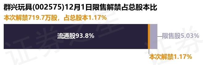 证券之星消息,根据市场公开信息整理,群兴玩具(002575)于12月1日将有719.7万股限售股份解禁,为公司股权激励限售股份,占公司总股本1.17%。(本次数据根据历史公告整理得出,实际情况以上市公司最新公告为准)本次解禁后,公司还有3100.45万股限售股份,占总股本5.03%。具体如下图所示:
