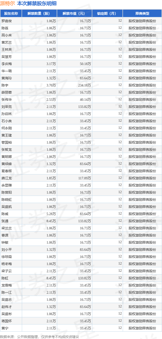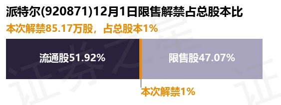 证券之星消息,根据市场公开信息整理,派特尔(920871)于12月1日将有85.17万股限售股份解禁,为公司股权激励限售股份,占公司总股本1.0%。(本次数据根据历史公告整理得出,实际情况以上市公司最新公告为准)本次解禁后,公司还有4000.52万股限售股份,占总股本47.07%。具体如下图所示: