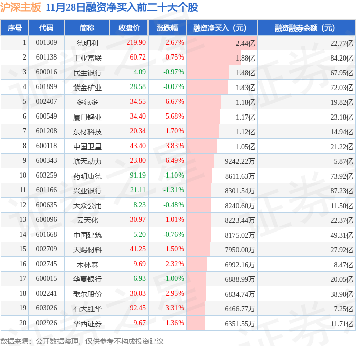 沪深主板融资净买入前三分别为:德明利(001309)融资净买入2.44亿元、工业富联(601138)融资净买入1.88亿元、民生银行(600016)融资净买入1.48亿元,前20具体见下表: