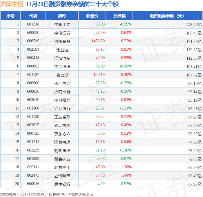 沪深主板融资融券余额前三分别为:中国平安(601318)融资融券余额243.92亿元、中信证券(600030)融资融券余额188.43亿元、贵州茅台(600519)融资融券余额171.34亿元,前20具体见下表: