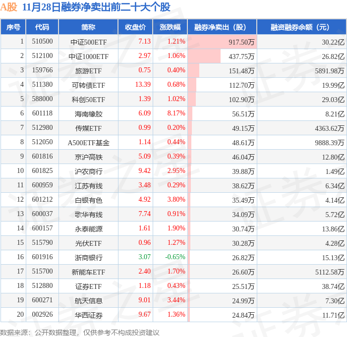 A股融券净卖出前三分别为:中证500ETF(510500)融券净卖出917.5万股、中证1000ETF(512100)融券净卖出437.75万股、旅游ETF(159766)融券净卖出151.48万股,前20具体见下表: